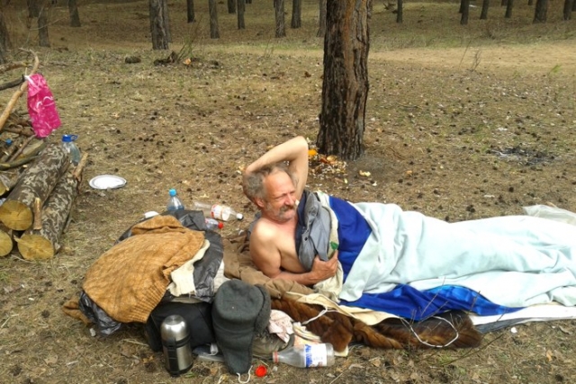 Лежбище иностранца нашлось быстро - между карьером и конно-спортивной школой. Питер изволил почивать, мы застали господина в постели. На первый взгляд он больше напоминал аборигена местных лесов Петю, чем Питера. Некую разницу культур и менталитетов обозначал разве что относительный порядок вокруг бивуака: аккуратная поленница дров, мусор по стопкам - стекло, пластик, горстка апельсиновой кожуры. Да и отсутствие специфического запаха, который нередко сопровождает местных бомжей.