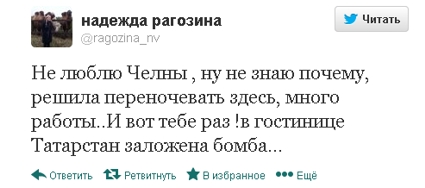 Будучи в Набережных Челнах заместитель министра юстиции РТ Надежда Рагозина разместилась в гостинице "Татарстан". В два часа ночи в ее "твиттере" появилась такая запись: