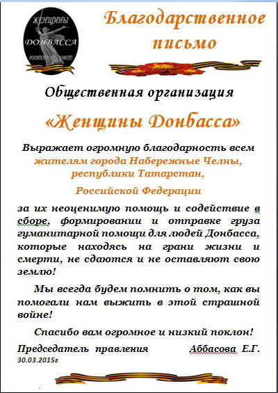 "Общественная организация "Женщины Донбасса" выражает огромную благодарность всем жителям города Набережные Челны, Республики Татарстан, Российской Федерации за их неоценимую помощь и содействие в сборе, формировании и отправке груза гуманитарной помощи для людей Донбасса, которые, находясь на грани жизни и смерти, не сдаются и не оставляют свою землю! Мы всегда будем помнить о том, как вы помогали нам выжить в этой страшной войне! Спасибо вам огромное и низкий поклон! Председатель правления Аббасова Е.Г.", - говорится в письме.
