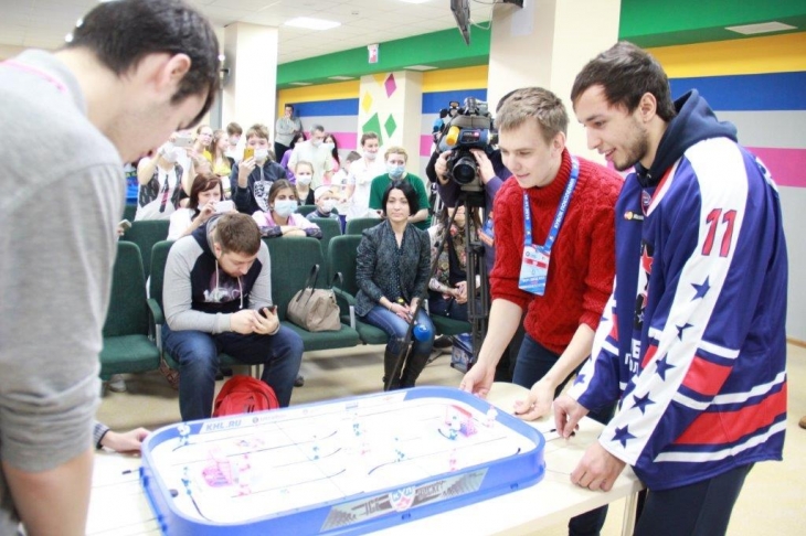 В детскую больницу артисты и спортсмены приехали перед матчем "Кубка Поколения" МХЛ. Среди гостей были актеры Влад Канопка, Иван Дубровский и Александр Соколовский, а также капитаны сборных "Запад" Виктор Кальной и "Восток" Дмитрий Антонов. Гостей сопровождали главный врач КДМЦ Тимур Мубаракшин и начальник управления физической культуры и спорта горисполкома Наталья Безрукова. Делегация посетила зал лечебной физкультуры. Накануне сюда привезли подарки от МХЛ - 7 тренажеров для занятий, предназначенных для самых маленьких пациентов. Дети, проходящие лечение, продемонстрировали возможности оборудования. Затем гостей проводили в конференц-зал, где их уже с нетерпением ждали дети. Они вместе с командой больничных клоунов подготовили вопросы для любимых героев сериала и с любопытством их задавали. Встречу решили разбавить игрой в настольный хоккей, который также подарили детям КДМЦ. Ребятам было предложено сыграть с настоящими звездами МХЛ. Гости щедро раздаривали свои автографы и фотографировались на память, и желали всем скорейшего выздоровления.