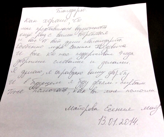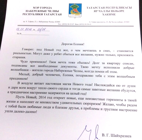 "Спасибо благотворителям, мы выкупили долг Есении. Вручаю ей от Вашего лица письмо! Процветания всем", - написал Василь Гаязович.