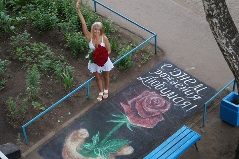 ...В семь утра раздался звонок по телефону с просьбой выглянуть в окно. На асфальте у подъезда я увидела необычное поздравление, а на скамейке лежал большой букет из роз. Это был самый лучший подарок в моей жизни! (автор - Алексей Шпорин)