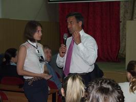 Мэр решил поговорить со студентами о развитии города. «Что нужно делать, чтобы город шел вперед? Есть такое слово. Что это за слово?» - спросил он, сняв пиджак и устремившись по рядам с микрофоном. «Нужно любить свой город», - предположила одна из девушек. «Это главное, но это должно быть потом, - ответил Василь Гаязович. - А что сначала, какое слово?» Слово никак не находилось. Потом назвали «инновационность», как выяснилось, близкое к тому, чего добивался Шайхразиев. «Я имел ввиду слово «креативность», - сказал мэр и написал его на доске.
