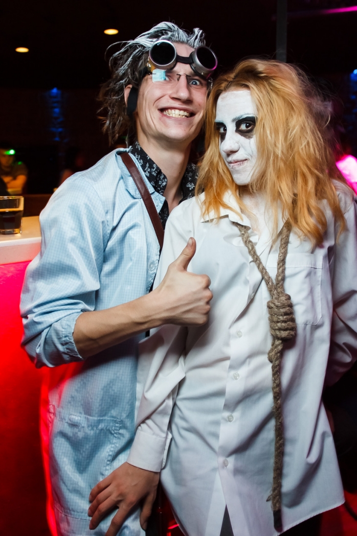 Третье место в конкурсе присудили детально продуманному парному образу страшненьких жениха и невесты с петлей на шее. Их наградили двумя тысячами рублей. Вторую симпатию (с немалым мужским акцентом) и 3000 рублей отдали стильной и артистичной Малефисенте. А главный приз в пять тыщ унесла троица в хаки-стайле и таких же рукотворных масках.