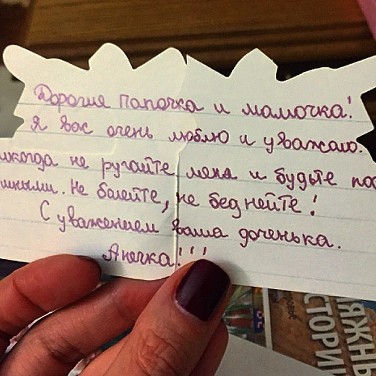 Во всех своих записях мама называет Анну не иначе, как «смысл жизни», «моя батарейка», «моя любовь». В инстаграме мама модели показала записку, которую сентиментально хранила много лет: «Мамочка и папочка, я вас очень люблю и уважаю, никогда не ругайте меня и будьте послушными. Не болейте, не беднейте!» - написала Аня в третьем классе.