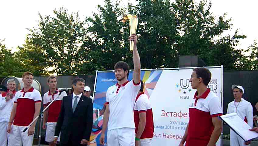 В 8 часов вечера Огонь XXVII Всемирной летней Универсиады, пройдя по пяти континентам и большей части России, прибыл в Набережные Челны. Торжественная церемония встречи состоялась у мемориала "Родина-Мать" в поселке ГЭС. Из рук факелоносца Тукаевского района Огонь принял руководитель исполкома Набережных Челнов Фархад Латыпов. И после короткой зажигательной речи передал факел мастеру спорта международного класса по тхэквондо, победителю прошлой Универсиады в Китае Арсену Цинаридзе, который и пробежал первый этап.