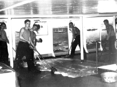 Экипаж крейсера – шестьдесят человек. Всех надо накормить. Каждый вечер кок на камбузе варил бульон в 50-литровом баке, чтобы на следующий день к обеду, бросив в него нехитрые ингредиенты, приготовить суп. Бак с горячим бульоном ставил под раздаточным окном. И так каждый день.
