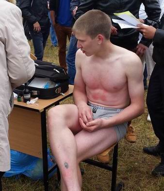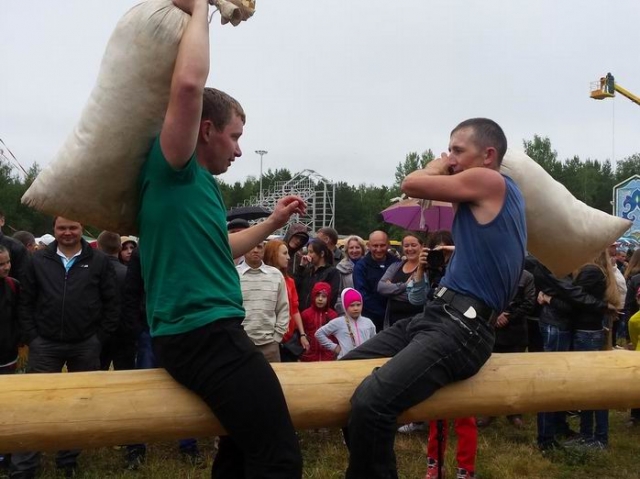 А вот во время боев с мешками небольшой дождь оказался очень кстати. Участники рассказали, что на мокром бревне удержаться легче, потому что одежда липнет к нему. Один из участников специально пришел в джинсах. Говорит, мол «джинса» как нельзя лучше подходит для этого вида соревнований — и держит крепче и не рвется.