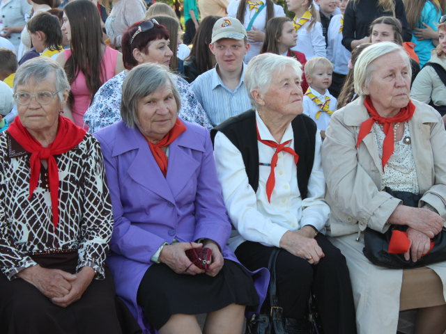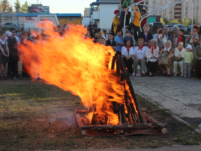 Не забыли организаторы и про один из главных атрибутов пионерии – сборы у костра с торжественными речами и песнями. Глядя на разрастающееся пламя, дети и пришедшие на встречу ветераны исполнили знаменитую пионерскую песню «Взвейтесь кострами, синие ночи». Нестройный хор из юношеских и взрослых голосов старательно протянул: Близится время светлых годов, клич пионеров «всегда будь готов!»…