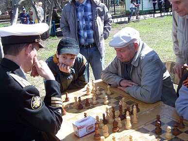 Молодежь, увидев ветеранов, подходила к ним и от всей души благодарила за мирное небо. Виновники торжества с улыбкой наблюдали, как все вокруг радуются ясному дню, поют «Катюшу», танцуют, едят солдатскую кашу. А бой ведут только на шахматной доске...