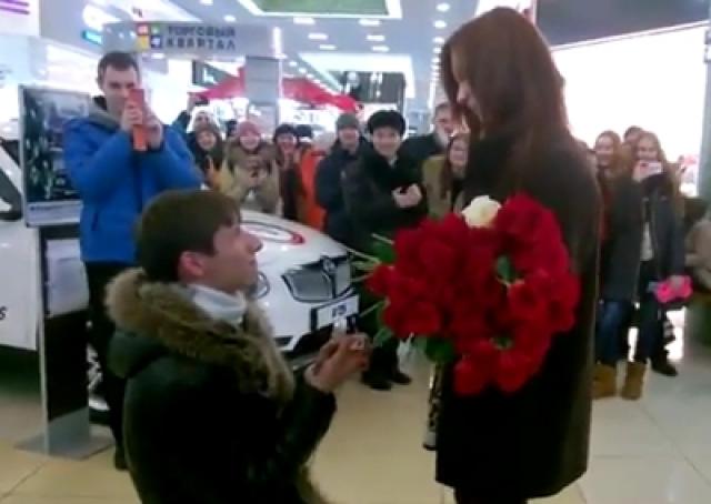 Весьма оригинальное предложение сделал влюбленный житель Набережных Челнов своей даме сердца. Пока девушка прогуливалась по ТЦ "Торговый квартал", к ней неожиданно стали подходить совершенно незнакомые прохожие и вручать по одной красной розе. Закончил этот цветочный подход сам инициатор сюрприза - молодой человек вручил девушке белую розу и, встав на одно колено, предложил выйти за него замуж. Девушка ответила: "Да".