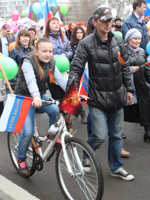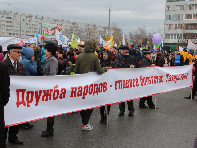 По традиции колонны шли с цветами, воздушными шариками и транспарантами. Звучали лозунги: «Челны - культурный город», «Молодежь - это будущее нашего города». «Крым снова дома» и «Севастополь был, есть и будет».
