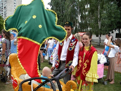 Семья Шагиевых, Азамат и Чулпан, смастерили самую патриотическую коляску парада. Огромная ладья, символ города, исполнена из полутора баллонов монтажной пены, отрезка полипропиленовой трубы, проволоки и отреза ткани. Национальные костюмы Шагиевы достали в сельском клубе.