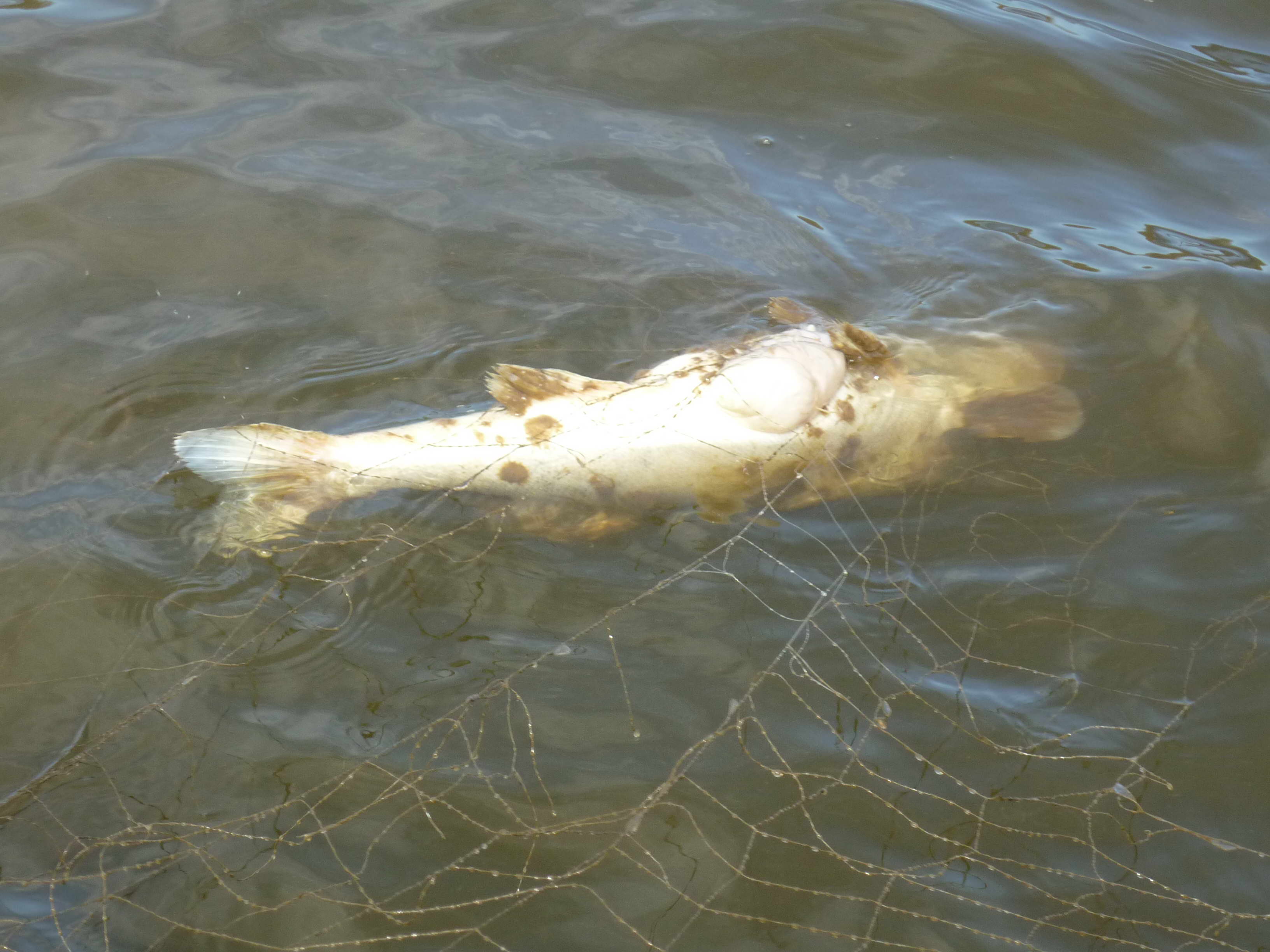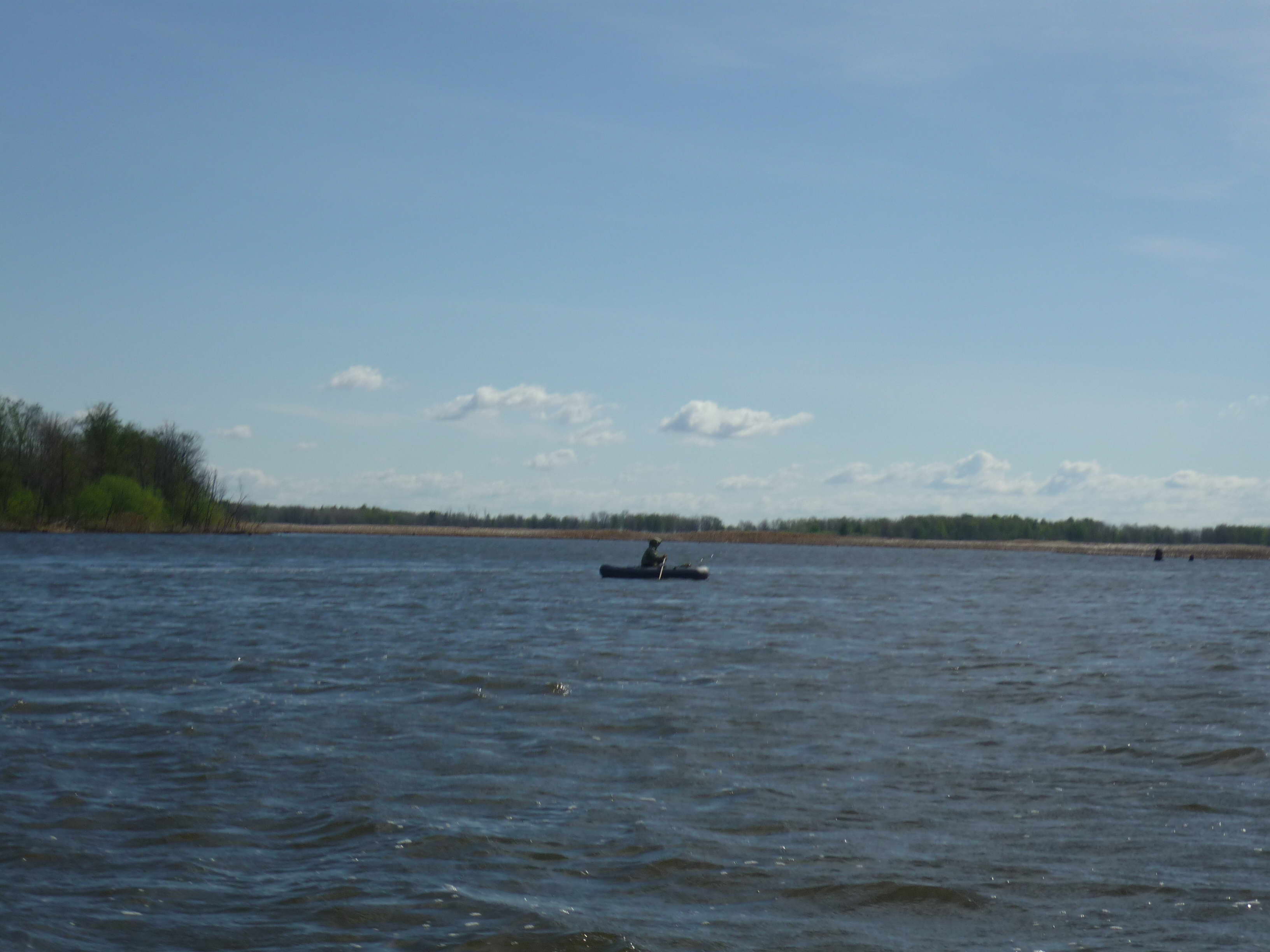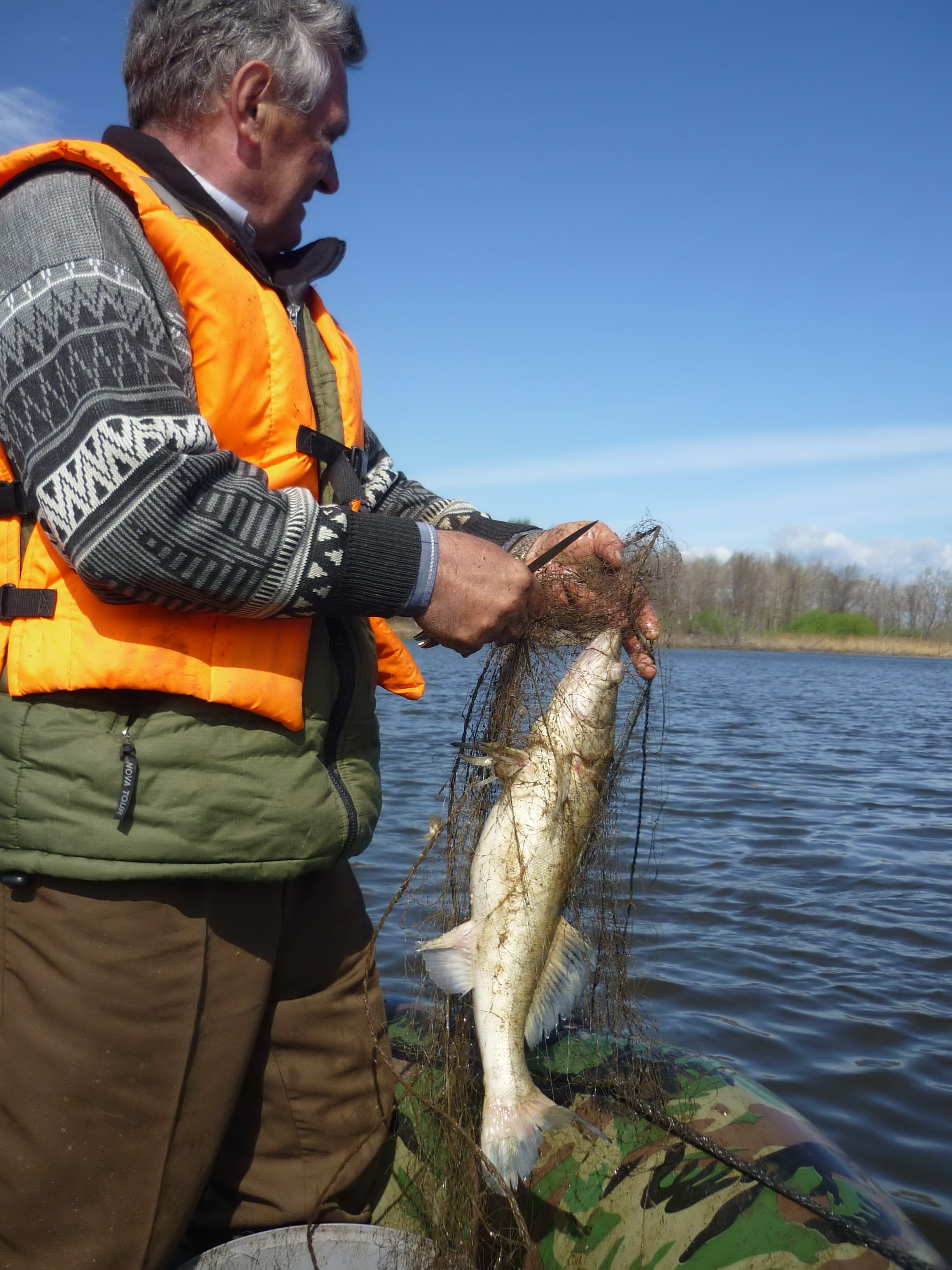 На этот раз была выбрана акватория в районе Мензелинска и совхоза имени Воровского. Погода в этот день не позволила плодотворно поработать. Сильный ветер, до 6 м/сек, поднял на широких разливах волну. Если при мощном моторе на скорости можно было легко глиссировать по волнам, то тралить крюком по дну на малых оборотах было проблематично - волны окатывали холодным душем брызг. Поэтому ограничились проверкой тихих заводей и проток. "Улов" был небольшим, но очень наглядным. Например, вытащенная 50-метровая старая сеть воочию продемонстрировала все варварство браконьеров. Вся сеть была забита мертвой рыбой: десятки протухших судаков, лещей и щук.