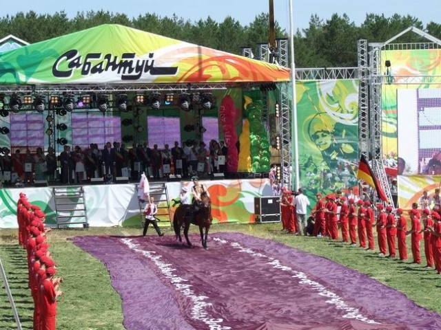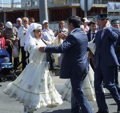 На Сабантуй пришли пять пар, расписавшихся в этот день в загсе. Молодоженам дали белых голубей, которых они выпустили в небо над майданом. Естественно, отдали дань универсиаде — на сцену пригласили тех, кто будет представлять наш город (в составе сборных) на студенческих играх в Казани — команду синхронисток, титулованных борцов «куреш» Рамиля Хисматуллина и Рената Ахметшина. В этом году борьба на поясах впервые включена в программу спортивных соревнований на универсиаде.