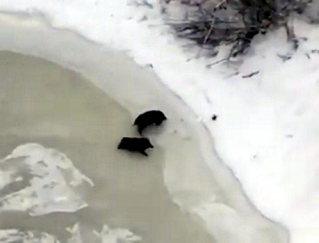 Вертолет главы "Таспиртпрома" напугал двух кабанов, которые оказались на льду речки (видео)