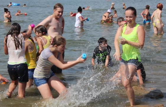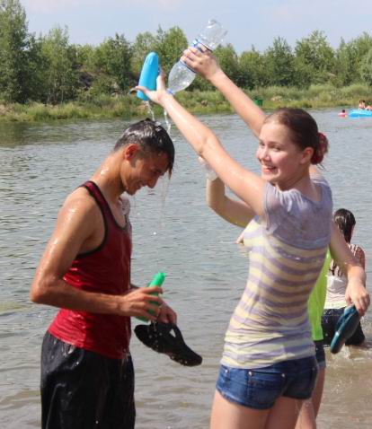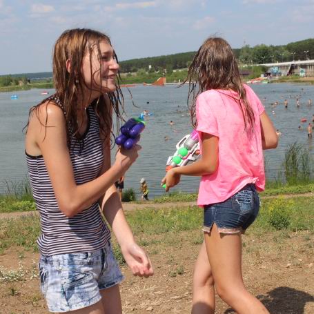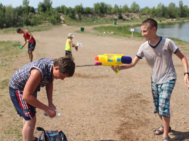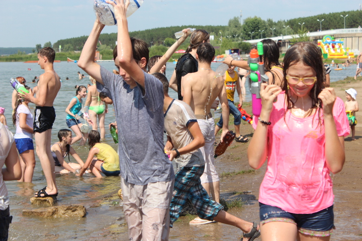 Сегодня на городской набережной прошел "водный бой". Организатор мероприятия - 13-летний Роберт Потехин, который подсмотрел идею в Казани. Собралось около 20 человек, вооруженных «капитошками», ведрами, баллонами, брызгалками, водяными пистолетами и автоматами. Бой проходил по принципу каждый за себя. Пленных ребята не брали — уже через пару минут все участники были облиты с ног до головы. Благо, фотографам и прохожим удалось каким-то чудом остаться сухими. Вдоволь набрызгавшись на суше, участники боя с визгами и криками побежали к реке, где и продолжали водную баталию. Отдыхавшие пляжники с некоторой настороженностью наблюдали за всей этой визжащей вакханалией. Но они остались сухими...
