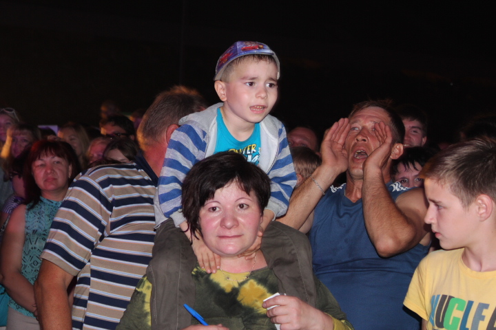 После официальных речей и церемоний на сцену вышел ансамбль «Здравствуй, песня». Коллектив исполнил проверенные временем советские и зарубежные шлягеры. Ближе к концу выступления ансамбля народ устремился ближе к сцене – все ждали выхода группы «Любэ». Чем сильнее люди проталкивались, тем беспокойнее становились лица полицейских. Часть зрителей истошно просили Расторгуева исполнить «Березы», но ее он так и не спел. Зато исполнил многих других любимых народом песен. Челнинцы хором пропели «Ты неси меня река». Отыграв часовую программу, участники группы спешно покинули сцену. После выступления некоторые поклонники коллектива искали Расторгуева, сокрушаясь, что он так быстро ушел.
