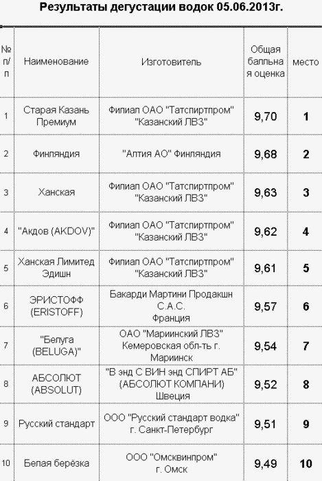 В Госалкогольинспекции республики прошла дегустация водок премиум-класса (от 700 до 1800 рублей за литр). Комиссии представили 10 образцов водок: 4 местного производства, 6 российского и импортного производства. Лучшими, по мнению экспертов, стали (в порядке убывания): «Старая Казань Премиум», «Финляндия» и «Ханская».