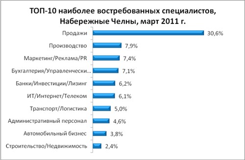 - В будущем будут востребованы, во-первых, менеджеры по продажам. Они входят в ТОП-10 самых нужных специалистов несколько лет подряд, и тенденция сохранится. К примеру, в начале 2011 года каждая третья челнинская компания искала сотрудника в департамент продаж. Каждая компания что-то продает и что-то покупает, и именно от отдела продаж зависит входящий поток денежных средств компании. Число вакансий для «сэйлзов» не снижалось даже в кризис, найти хорошего менеджера по продажам – большая удача для компании.