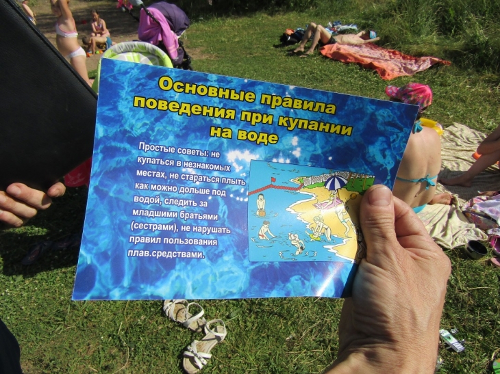 Пессимистические прогнозы специалистов рейдовой бригады сбылись. Без полицейских рейд превратился не в профилактику, а в общение с народом для отчета. Инспектор ГИМС Зиннур Мустафин, правда, нашел себе дело, он стал раздавать посетителям пляжа памятки и инструкции о том, как вести себя на воде. Люди охотно брали памятки, изучали их. Айрат Хуснуллин и главный специалист администрации Автозаводского района Эдуард Хаджаев пытались убедить людей в том, что купаться в таком месте не стоит. Поводов для таких бесед было предостаточно, например, в воде у берега барахтались без взрослых детишки 3-6 лет. Но если в запасе у специалистов была лишь пара аргументов - место необустроенное, не санкционированное, то у людей своих контраргументов была масса. От "с детства сюда ходим" до "Сандали" - пляж платный, 100 рублей за вход, он далеко и природы там нет, а сюда близко, хорошо и природа есть!" Через какое-то время, переждав "натиск" рейдовиков, посетители пляжа пошли в наступление: