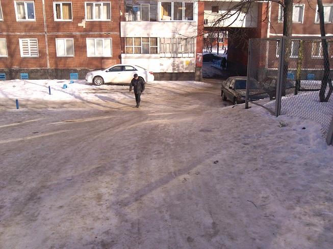 Не по-зимнему теплая погода в Набережных Челнах сделала все пешеходные тротуары и проходы просто опасными. Земля покрыта бугристым скользким льдом. Дворники старательно посыпают дорожки песком (этот песок виден в углублениях бугристого льда или на его поверхности), но ходить все равно приходится осторожно. А кроме того, в городе есть проблема, которую никак не могут решить власти. Это бесхозные участки. Только в 23-м комплексе местные жители показали «Челны ЛТД» два участка, на которых устранением гололеда никто заниматься не хочет. Люди здесь запросто могут покалечиться.