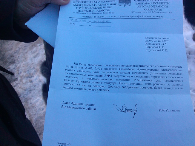 - О дорожке вдоль домов 23/02 и 23/04 мы написали в администрацию города - сейчас решается вопрос о передаче ее на содержание муниципальному предприятию автодорог, - говорит начальник отдела благоустройства УК «Ремжилстрой» Людмила Луник. Коммунальщики обратились сначала в администрацию Автозаводского района (10.12.15 г.), потом в исполком города на имя начальника управления городского хозяйства (письмо от 25.01.16г.) и на имя директора МУП ГПАД (письма от 25.01.16г. и от 1.02.16г.). Главы администрации Автозаводского района Раушан Усманова ответила 29 декабря 2015 года, что обратилась в свою очередь к начальникам управлений горисполкома Тимергалиеву и Киямову для установления балансодержателя тротуара. «На сегодняшний день решение оп данному вопросу до нас не доведено. Поэтому содержание тротуара будет находиться на нашем контроле до его решения».