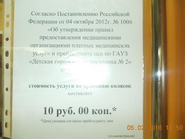 Еще при входе в лечебное учреждение посетителей предупреждает объявление о том, что услуга по хранению колясок является платной, ее цена 10 рублей. Рядом со входом находится небольшое пристроенное помещение, куда можно сдать свой четырехколесный транспорт. Перемещаться по коридорам больницы с колясками запрещают, ссылаясь на санитарные правила.