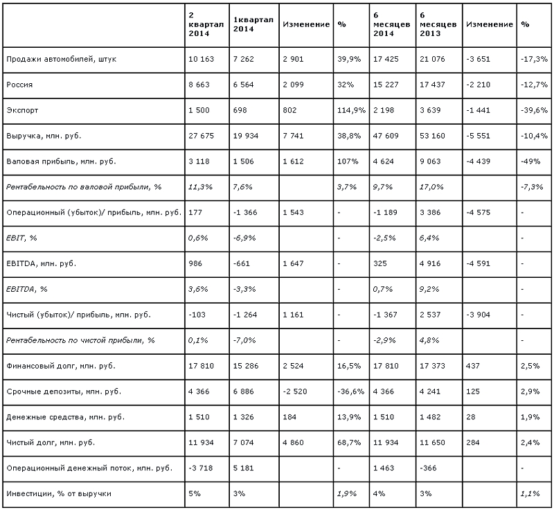 Пресс-служба ОАО "КАМАЗ" публикует таблицу основных финансовых показателей, отмечая при этом тенденцию их улучшения во втором квартале 2014 года: