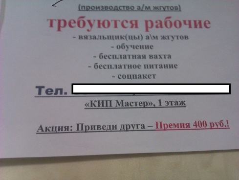 Кадровый кризис в Набережных Челнах имеет уже давнюю историю. Предприятия с ним борются по-разному. Кто-то идет в институты и школы, вербуя там своих будущих работников (такой путь выбрали в «Челныводоканале»). Кто-то набирает сотрудников в окрестных деревнях и селах (так решают проблему на «Предприятии автомобильных дорог»). Наш «свободный репортер» Алмаз Нигмятзянов прислал фотоиллюстрацию еще одного варианта. Этот способ заимствован из арсенала приемов «сетевого маркетинга». Приведешь друга на производство автомобильных жгутов – получишь премию в четыре сотни!
