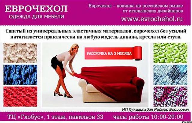 Вы еще сомневаетесь? Обдумаете, а не обшить ли старую мебель? Так вот гоните все сомнения и подобные мысли прочь! Обшивка старой мебели, похожа на покупку «кота в мешке», поскольку выполняется, как правило, работниками кустарного производства, что отнюдь не гарантирует желаемого вами результата. Что же касается цены на подобную услугу, то надо сказать, что самая низкая цена два раза превышает стоимость Еврочехла. Не стоит тратить лишние деньги, время и нервы, когда можно просто прийти в наш магазин, воочию увидеть Еврочехлы, подобрать расцветку и фактуру ткани, которая понравится вам больше, и наслаждаться обновлением вашего мягкого друга, уже сегодня, тем более что теперь у нас действует система кредитования и беспроцентная рассрочка на три месяца.