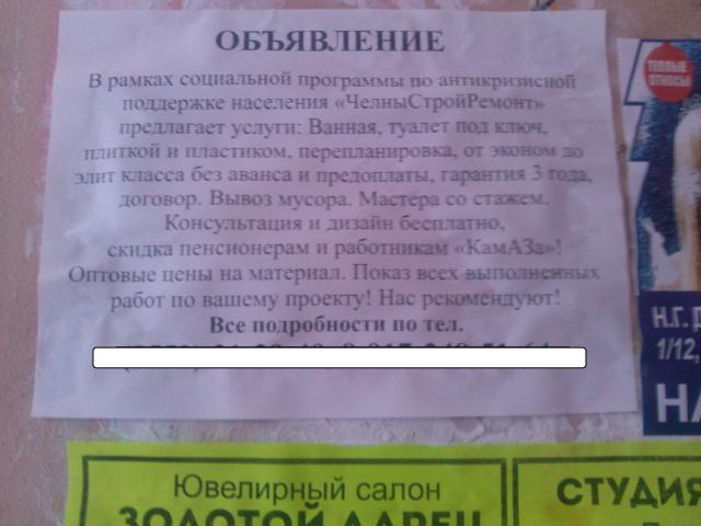 - Это ошибка. У нас фирма называется "Челныремонтстрой", - объяснил ситуацию редакции «Челны ЛТД» дизайнер фирмы. Но имя управляющей компании «Челныстройремонт» указано в объявлениях, расклеенных у входов в подъезды как минимум двух домов. Коммерсанты, видимо, не знают, что за такие ошибки можно быть наказанным. Юрист Наталья Михалева объяснила, что из-за объявления в суд может обратиться УК "Челныстройремонт" или клиент, которому будет оказана некачественная услуга. Клиент может сослаться на то, что был введен в заблуждение и приглашал мастеров УК, а не какой-то другой фирмы.