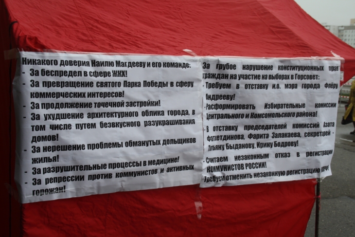 В Набережных Челнах активисты партии «Коммунисты России» утром организовали пикет возле входа в мэрию, потребовав отставки городских властей. Напомним, оппозиционеры протестуют из-за отказа в регистрации их кандидатов для участия в осенних выборах в Горсовет. Сегодня утром около 25 человек с красными флагами собрались у стен мэрии, потребовав отставки городских властей и руководителей избиркомов Центрального и Комсомольского районов: председателей комиссий Азата Фатхетдинова и Фарита Залакаева, секретарей - Татьяны Быданову и Ирины Бодровой. Чтобы лишний раз привлечь внимание, коммунисты установили возле входа в главное административное здание Набережных Челнов яркую палатку, «украсив» ее старым сталинским лозунгом: «Нет таких крепостей, которых большевики не могли бы взять».