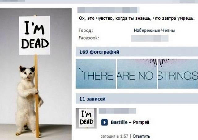 Ночью подросток сменил аватарку на своей страничке в соцсети - на ней кот держит плакатик с надписью "I`am dead" ("Я умер"). Также он изменил статус: "Ох, это чувство, когда ты знаешь, что завтра умрешь". И разместил песню "Pompeii" группы Bastille, в которой поется об одиночестве и проблемах.