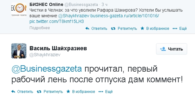 Электронная деловая газета Татарстана "Бизнес Online" попросила в микроблоге Василя Шайхразиева дать комментарий на свою статью об увольнении Рафара Шакирова, речь в которой идет о недополучении бюджетом Набережных Челнов многих миллионов рублей в результате сомнительных сделок с земельными участками, в которых засветились фамилии ряда городских чиновников и их родственников.