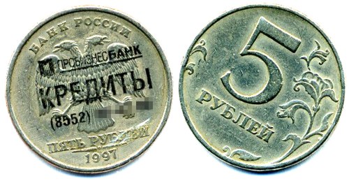 Руководитель пресс-центра Национального банка Республики Татарстан Владимир Герасимов сначала пошутил, когда узнал, что к нам в редакцию попала пятирублевая монета с рекламой одного из банков прямо на гербе России. Реклама на деньгах - надписи, штампы, наклейки - это явление нашего времени. Герасимов посоветовал нам пятирублевку оставить на память. Если рекламу нанесли ненадежно, то лучше ее стереть или снять.