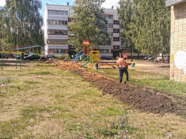 Во дворе дома 45/15/2 роют траншею. Работы ведутся второй день. Качели засыпали горой земли, траншеи не огорожены, а дети продолжают гулять и играть! И мамы и папы теперь предупреждают детей: "Осторожнее, смотри в яму не упади!"