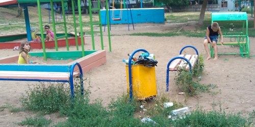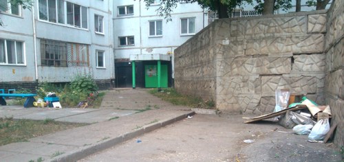 Это двор одного из домов в 48-м комплексе. Мусор здесь свален у подъездов, во всех удобных (по мнению выбрасывающих) местах, на газонах, в урнах и вокруг них. Мусор валяется даже на детской площадке.