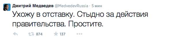 Микроблог премьер-министра России Дмитрия Медведева был взломан в четверг на несколько минут. Неизвестные разместили в нем сообщение: «Ухожу в отставку. Стыдно за действия правительства. Простите». Потом уже на лентах СМИ появились сообщения о том, что это писал не Медведев.