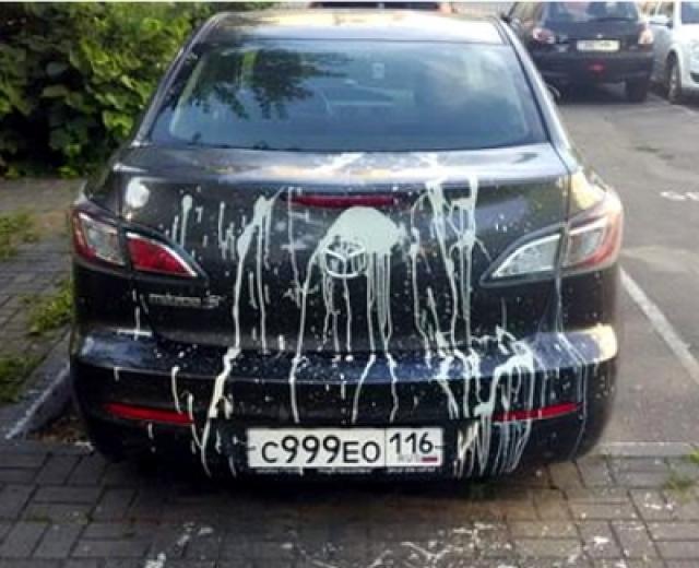 Похоже, что отголоски конфликта на юго-востоке Украины проявились в нейтральной Белоруссии. В Минске во дворе дома №15 по улице Якуба Коласа была облита белой краской серая "Мазда" с татарстанскими номерами. Автомобиль был припаркован по всем правилам, поэтому версия с наказанием за неправильную парковку отметается.