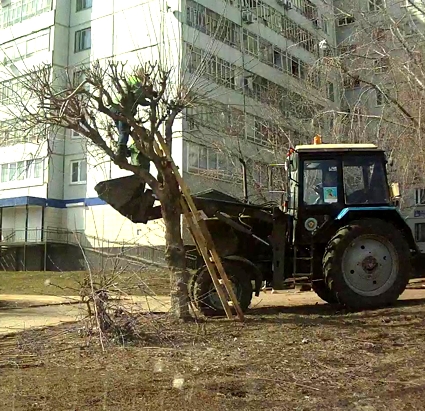 Набережные Челны, новости: 10-го апреля наш читатель зафиксировал, как работники управляющей компании, обрезая ветки с деревьев возле дома 32/01, нарушили правила техники безопасности. Из-за нехватки двух лестниц на троих рабочих один из них взобрался в ковш трактора и так поднялся на высоту: