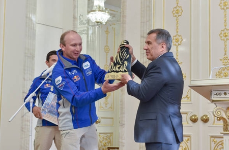 Сегодня в казанском Кремле чествовали победителей "Дакара-2015" и "Africa Eco Race-2015" - команду автогонщиков из Набережных Челнов "КАМАЗ-мастер". Рустам Минниханов в своем поздравлении отметил, что победы "КАМАЗ-мастера" красноречиво говорят о мощи российской и татарстанской промышленности и науки. После президент Татарстана вручил прославленным спортсменам государственные награды: Айдар Беляев удостоился ордена "За заслуги перед Республикой Татарстан", Андрей Каргинов, Айрат Мардеев, Антон Шибалов и Евгений Метлушка были награждены званиями "Заслуженный машиностроитель Республики Татарстан" и соответствующими знаками, благодарности также получили ряд работников "КАМАЗ-Автоспорта".