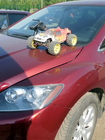 - Купил сыну модельку и сам увлекся, - говорит он. - Была сначала попроще моделька. Сейчас уже более профессиональные модели - и для воды, и для грязи, и зимой и летом ездим.