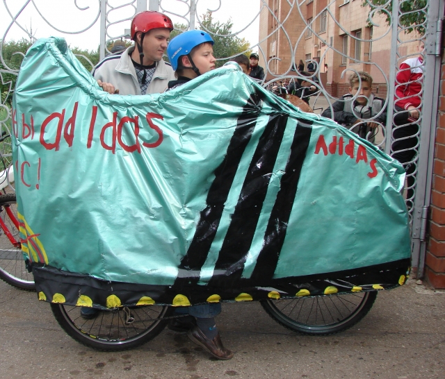 Павел Стройкин – давний друг газеты. В 2010 вместе с товарищами они отреставрировали раритетный «ГАЗ» к автопробегу в честь 65-летия Победы. В этом году он с 12-летним сыном Матвеем сделал из обычного велосипеда яркую кроссовку с тремя полосками. Агрегат стартовал от 46-й школы, где учится Матвей.