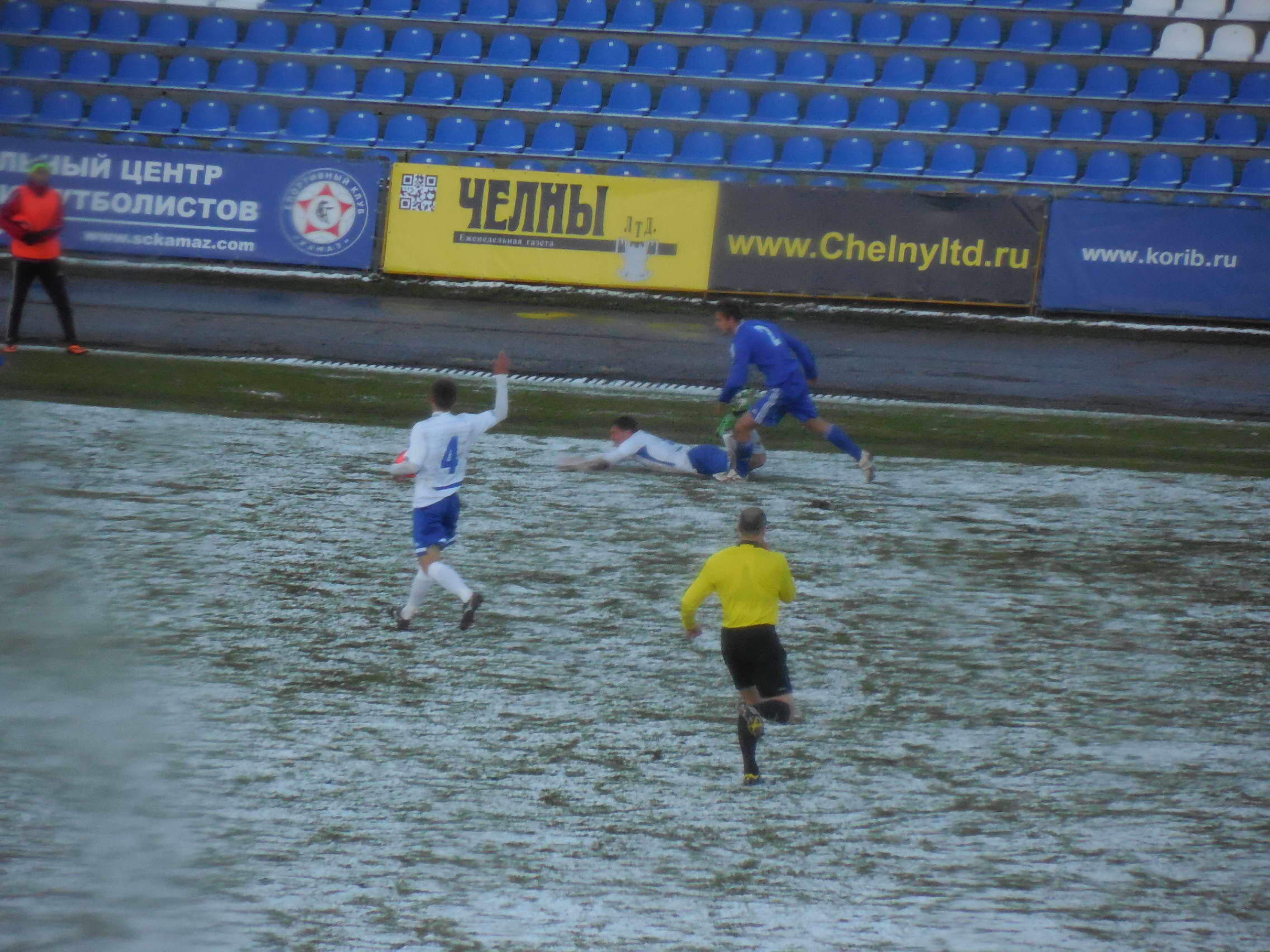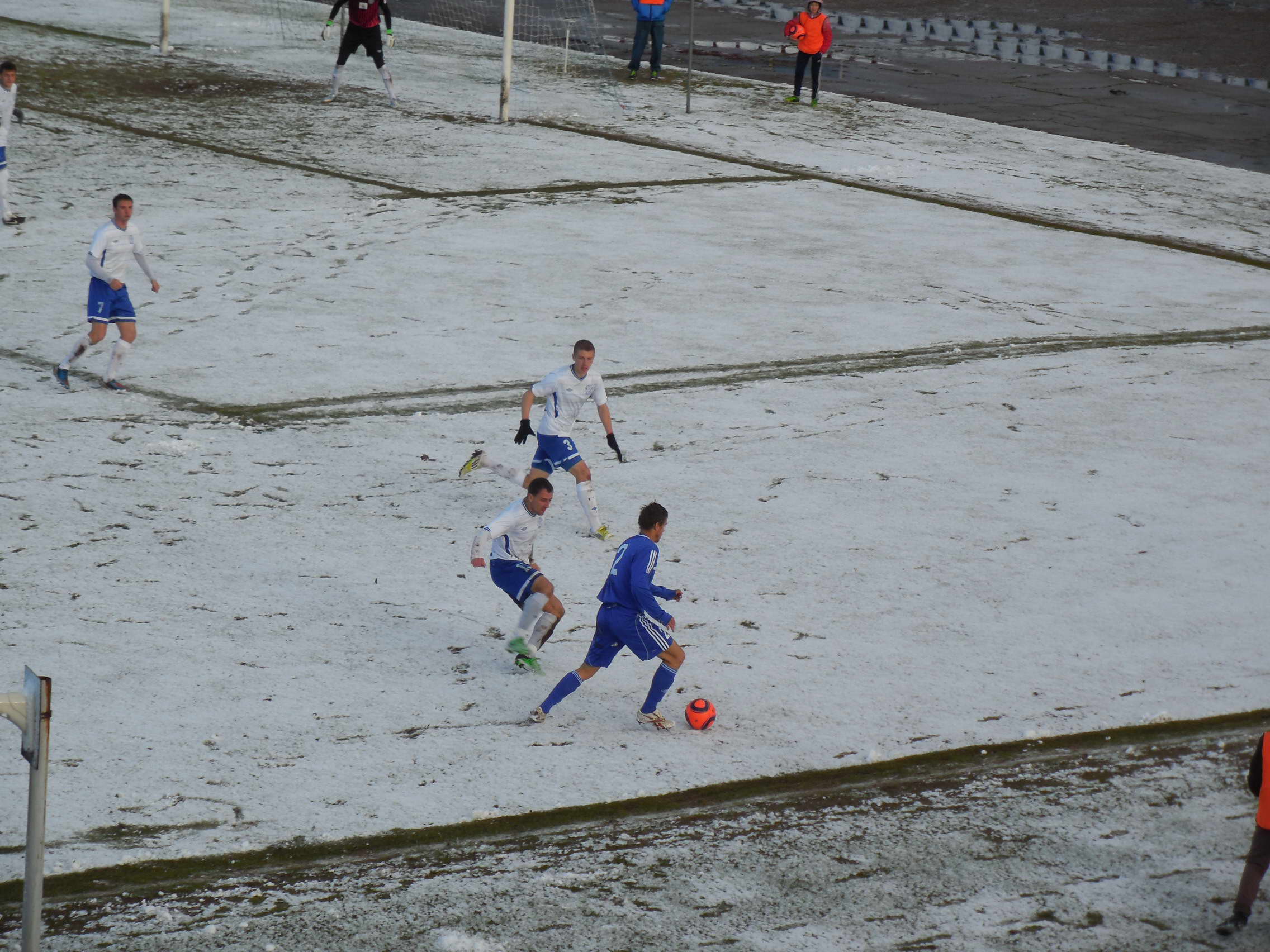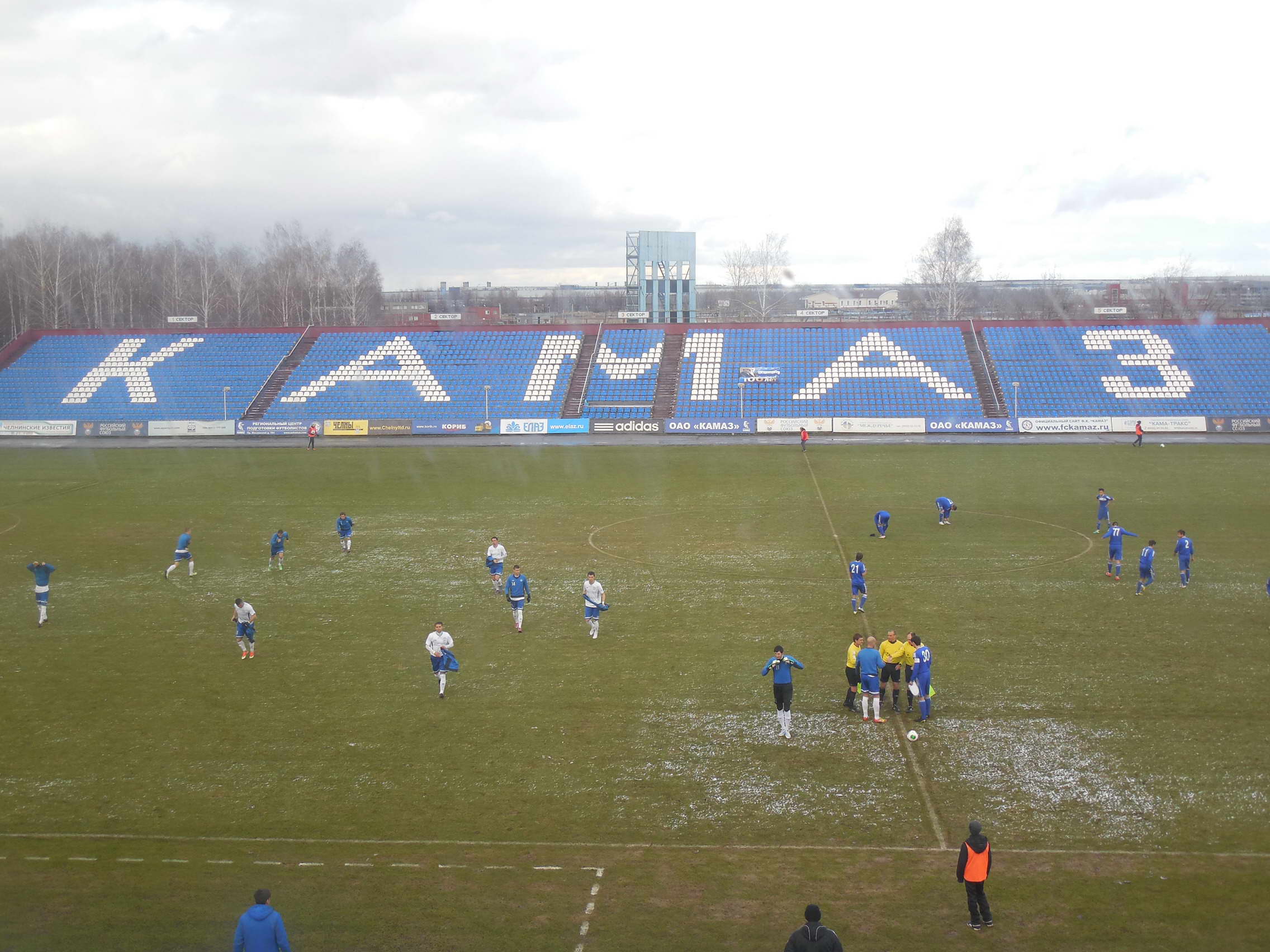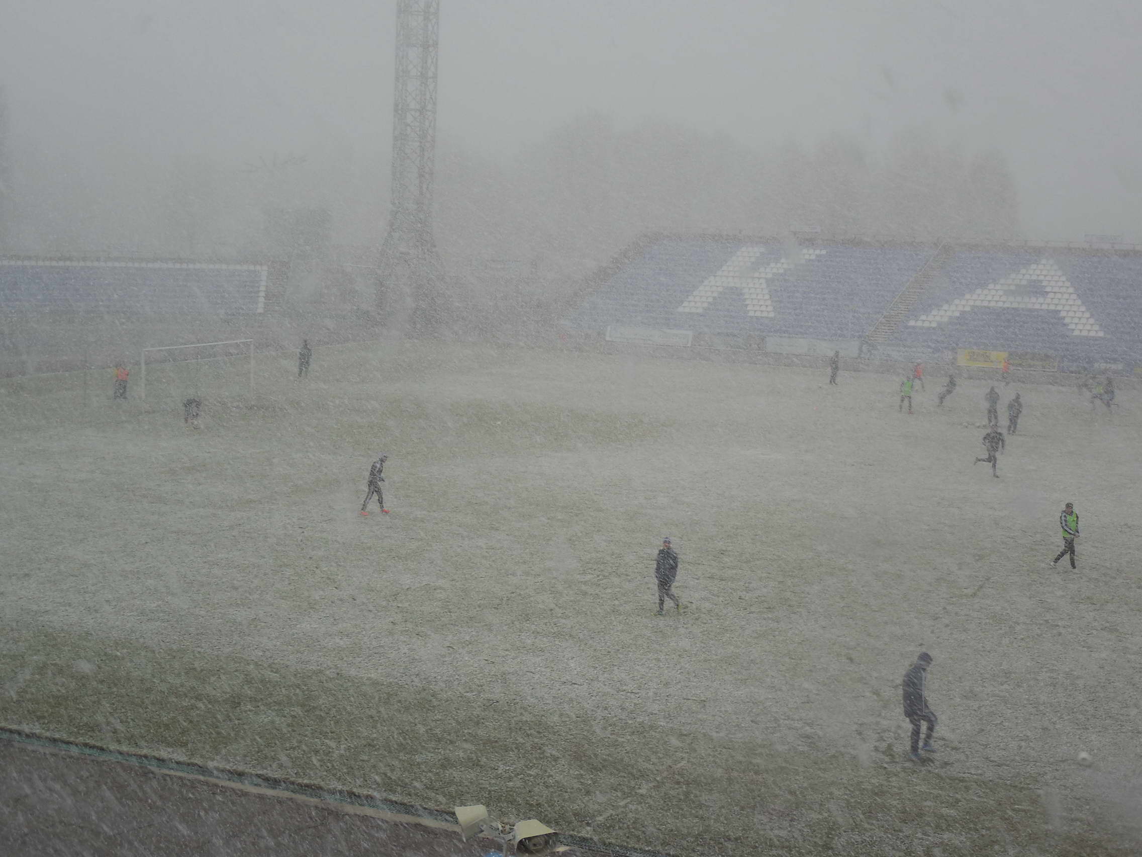 Перед игрой зарядивший снег запорошил все футбольное поле, но к началу матча выглянувшее солнце вновь позеленило поляну. Вязкий газон, пропитанная влагой и снегом трава не способствовали качественному футболу. Много было брака - мяч соскальзывал с бутс. Через 15 минут после стартового свистка новый заряд густого снега заставил арбитра остановить игру, чтобы работники стадиона смогли очистить разметку поля.